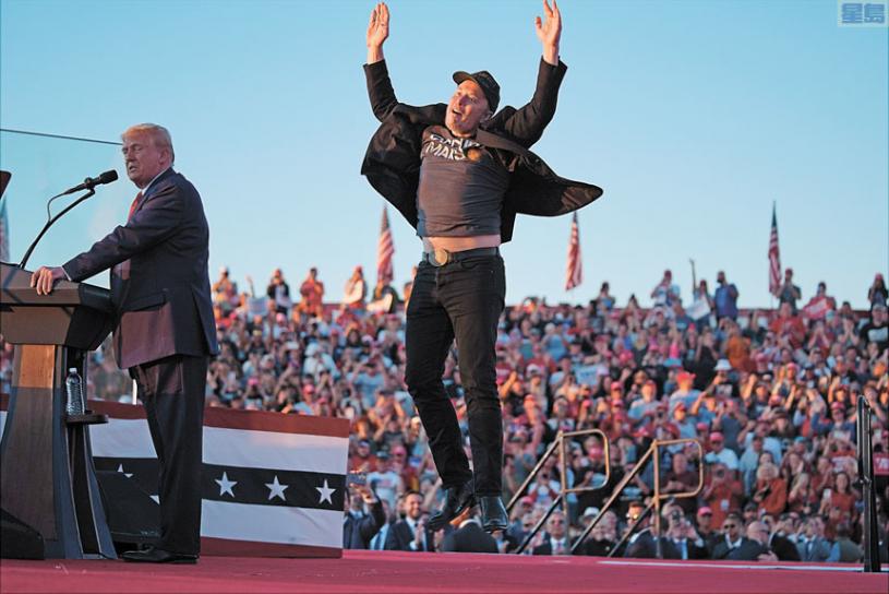 前總統特朗普重返賓州巴特勒(Butler)舉行造勢集會,邀請到億萬富豪馬斯克(Elon Musk)聲援。馬斯克展示熱烈姿態,現身時跳上講台,發言期間也異常激昂,令現場氣氛沸騰,他抨擊民主黨之餘,更形容特朗普許勝不許敗,否則這次將是國家「最後一次選舉」。