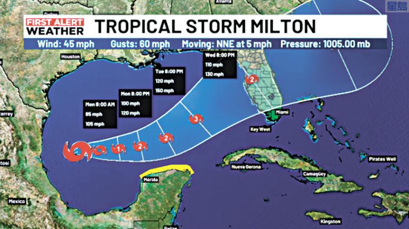 在颶風海倫造成創紀錄巨大破壞不到10天後,熱帶風暴米爾頓(Milton)又於5日早上在墨西哥灣西南部形成,預計本周稍後增強為颶風,襲擊佛州西海岸部分地區,給更多生命帶來威脅。