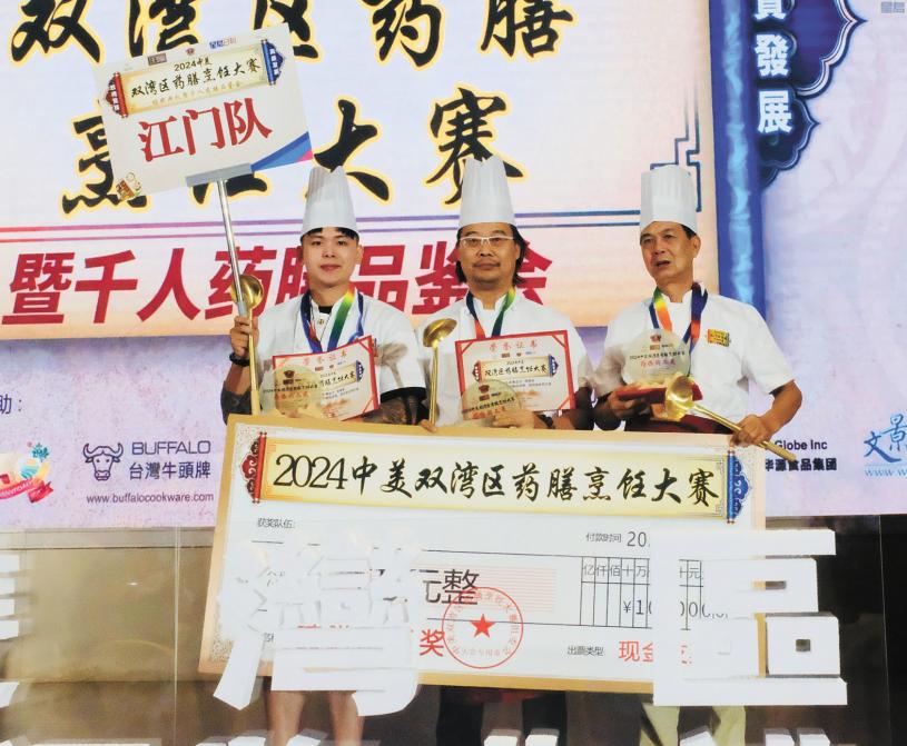 經過評審,本屆廚王隊大獎分別由江門隊和中美文化促進會隊摘得,江門隊的參賽作品為《老陳皮藥膳燉排骨》和《祖傳滋補雞蛋仔》;中美文化促進會隊的參賽作品為《跨界藥膳龍蝦湯》和《果香鳳凰》。