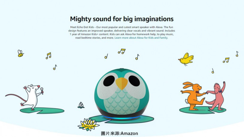 Amazon Echo Dot Kids 貓頭鷹版,專為兒童設計的智能揚聲器,結合學習與樂趣。透過 Alexa 播放音樂、講故事,還能幫助做作業!隨附 1 年 Amazon Kids+ 訂閱,內含豐富的兒童有聲書和遊戲。家長可輕鬆管理,設定時間限制及過濾內容,讓孩子安全探索世界。