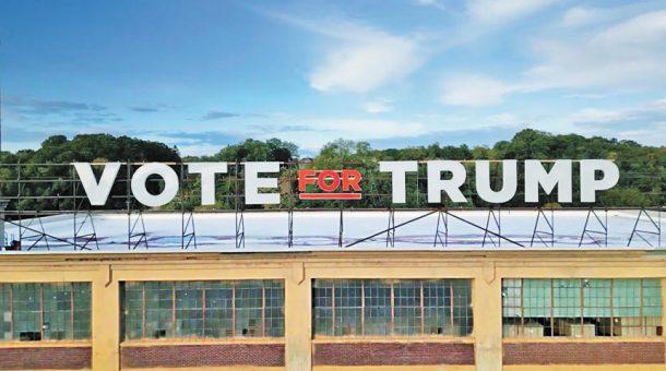 大樓頂部豎立100呎寬的「票投特朗普」巨型告示牌。網上圖片