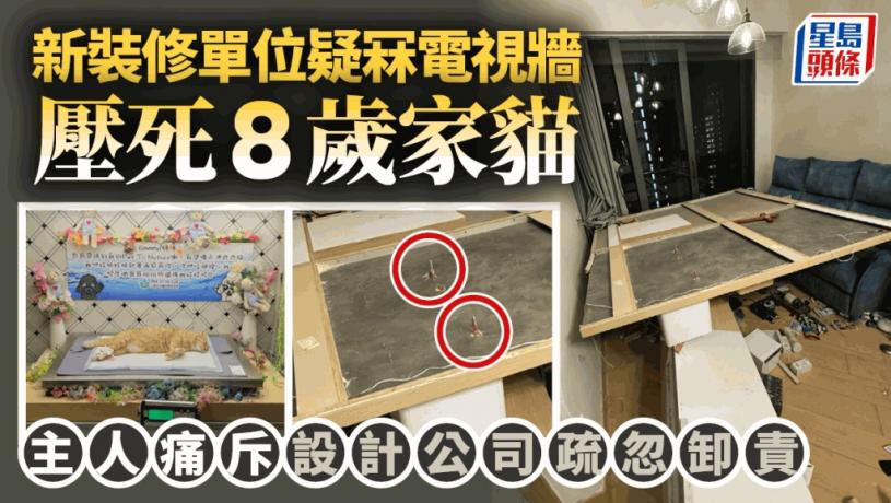 一名貓主今日(10月8日)在社交平台上分享心痛經歷,表示自己寓所新裝修不久後,電視牆突然倒塌,令其8歲寵物貓女「阿布」不幸喪命。貓主事後極度悲痛,無法入眠之餘更求診心理醫生,直指負責裝修的室內設計公司懷疑疏忽卸責。事件曝光後引起網民嘩然,紛紛到涉事公司社交專頁「派嬲」 。