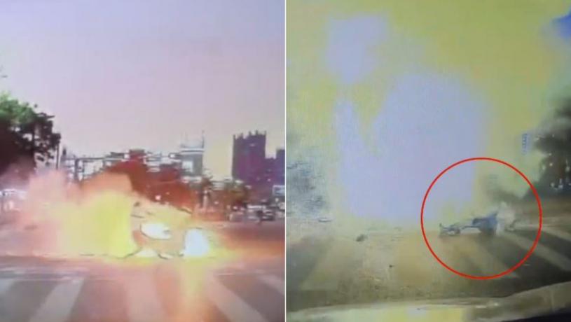 外賣騎手全身著火,棄車後不停在地上翻滾自救。影片截圖