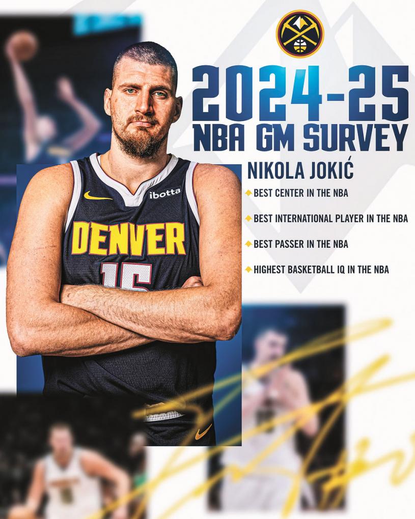 NBA官網8日發布了一年一度的總經理調查結果,約基奇在其中四項排名居首,分別是NBA最強中鋒、NBA最強國際球員、NBA最強傳球手、NBA最強籃球智商。掘金官方曬出了這一結果,並配文寫道:「大王」。從統計來看,約基奇在這四項投票中都屬於蟬聯,上賽季他也是排在第一。