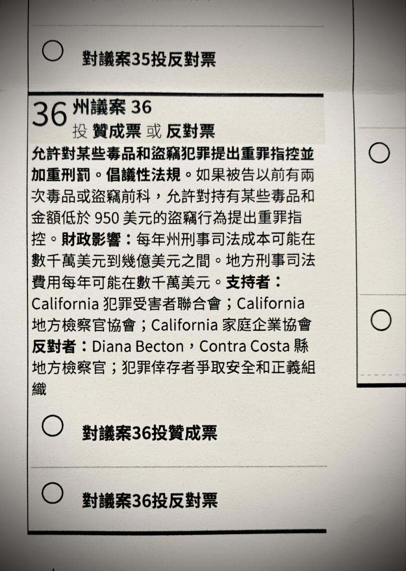 鑽石吧市議員鄧嘉猷(Dr. Chai Yu Teng)也表達了對36號提案的支持。他指出,47號提案將特定重罪改為輕罪、將950美元以下的盜竊歸為輕罪,即使多次作案也不會累計犯罪。而36號提案增加了犯罪種類,並授權法院能對累犯進行強制治療許可權,以糾正47號提案。雖然36號提案並非完美,但也是糾錯的第一步。