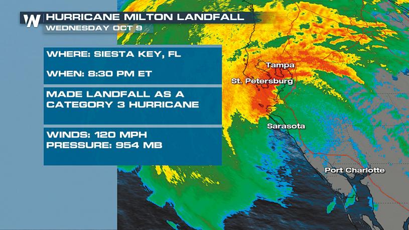 綜合美聯社、CNN和《華爾街日報》報道,國家颶風中心9日晚上大約8點半宣布,「米爾頓」以三級颶風的姿態,挾每小時120哩的最大持續風速,在薩拉索塔(Sarasota)附近的午休礁(Siesta Key)登陸,進入陸地後減弱為二級季風。截至登陸消息發出時,風眼位於薩拉索塔東北大約20哩,這次雖然未有正面吹襲坦帕灣(Tampa Bay),但危險程度沒有改變。