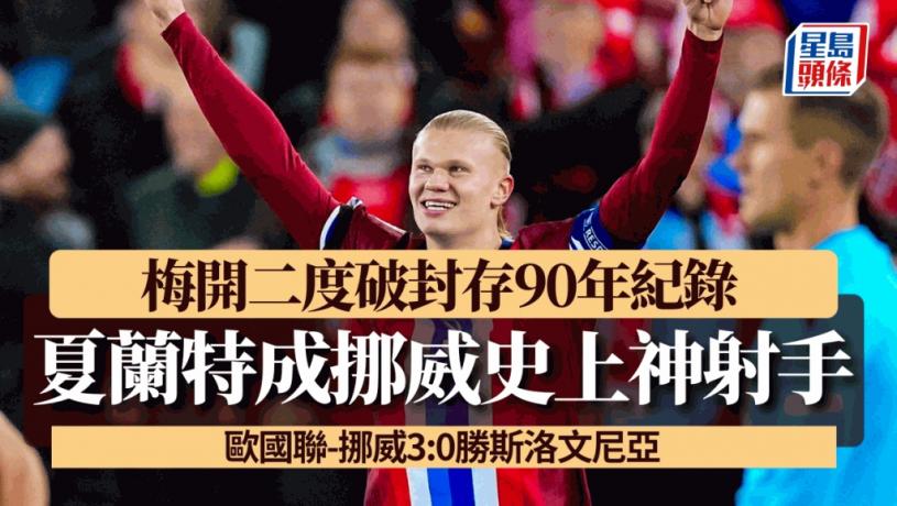 曼城挪威射手艾寧夏蘭特(Erling Haaland)又創紀錄,他於周四的歐洲國家聯賽B3組主場對斯洛文尼亞,代替因傷缺陣的馬田奧迪加特(Martin Odegaard)充當隊長,個人梅開二度領軍挪威大勝3:0。而夏蘭特國際賽累積射入34球,改寫名宿祖維(Jorgen Juve)保持了90年的33球挪威最多入球紀錄,成為挪威史上的神射手。