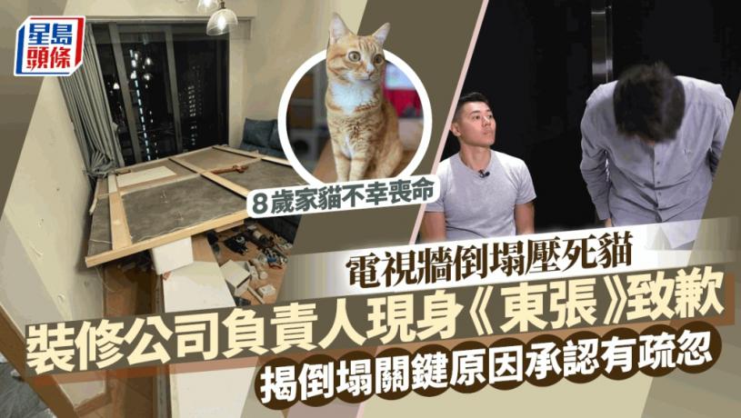 一名貓主日前於社交平台分享,指寓所裝修不久後電視牆突然倒塌,令其8歲的寵物貓不幸喪命。事主直指負責裝修的室內設計公司懷疑疏忽卸責,事件在網絡發酵後,今日(10日)播出的《東張西望》,裝修公司負責人吳先生主動聯絡《東張西望》對事件作出回應,負責人承認今次事件他們要承擔責任,並在節目中再度致歉。