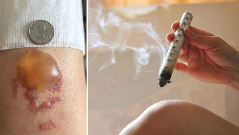 做艾灸後,田女士左小腿外側被燙傷,出現巨型水泡。