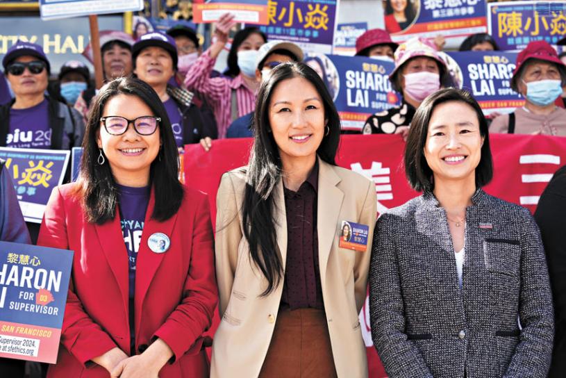 三位三藩市市參事候選人10日在市政廳門前召開新聞發布會,呼籲華裔選民,特別是英語能力有限的選民,將選票投給能代表他們社區的候選人:第一區現任市參事陳詩敏、第三區市參事候選人黎慧心,以及第十一區市參事候選人陳小焱。她們都是參選今次市參事選舉的華裔移民女性。