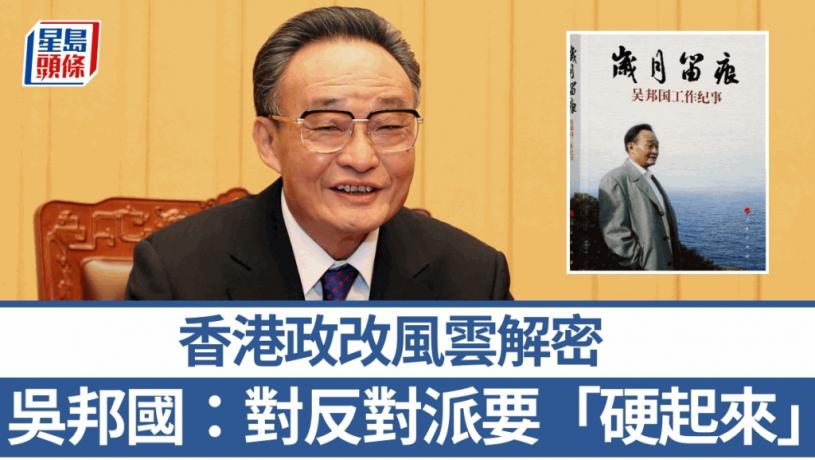 該書披露,吳邦國明確指出,現在反對派提出「還政於民」、搞「雙普選」,絕不只是修改特首和立法會兩個產生辦法那麼簡單,而是想要從根本上改變香港《基本法》確定的政治體制,是想在香港上台執政。反對派的本質是「反中亂港」,如果出現他們上台執政的局面,後果不堪設想。因此,面對反對派的猖狂進攻,我們只有堅決進行鬥爭,通俗地說就是要硬起來。