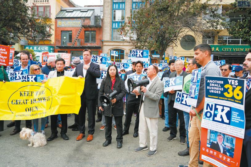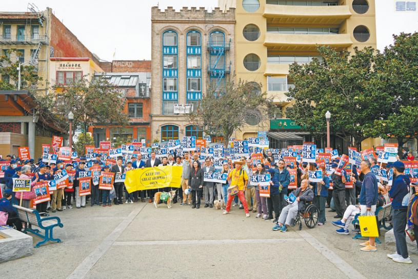 超過1000名居民昨天聚集在三藩市華埠花園角廣場,參加由華裔民主黨協進會、開放海旁大道組織及其他社區組織聯合舉辦的第8次反對K提案集會。集會後,分兩條路線巡遊,分別是華埠的士第德頓街、北岸區,沿途發出保護西區生命線的號召。
