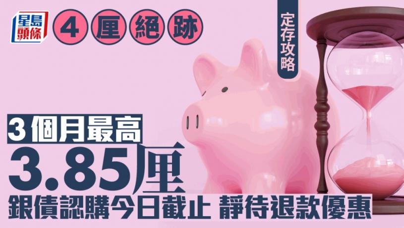 早前有銀行定存息率重現4厘,惟曇花一現,有關優惠已下架,據《星島頭條》搜查,現以3個月3.85厘為最高息。不過,銀色債券今日(14日)下午2時截止認購,根據往年情況,待下周三(23日)公布銀債分配結果,銀行普遍會推出定存優惠,搶銀債退款,食息一族可靜待有關優惠。