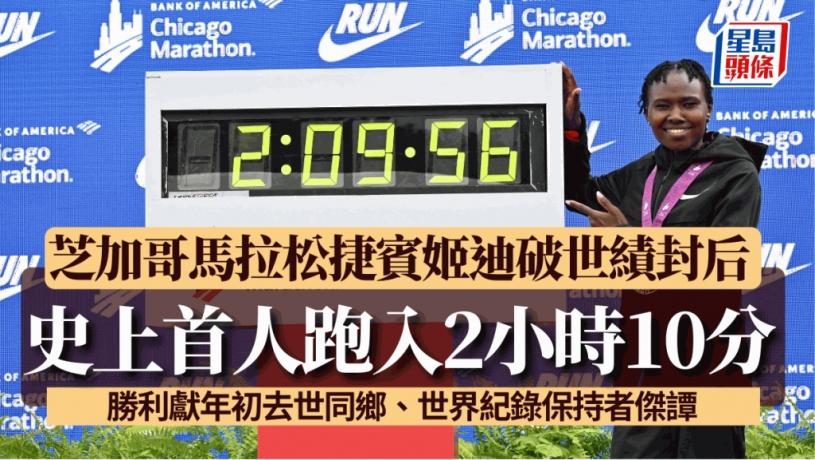 周日芝加哥馬拉松,肯尼亞女將捷賓姬迪(Ruth Chepngetich)以2小時09分56秒完成賽事,打破世界紀錄封后,更成為女子馬拉松史上首位在2小時10分內完賽之人。賽後,她喜言非常開心,並將勝利獻給年初因車禍去世的同鄉、男子世界紀錄保持者傑譚(Kelvin Kiptum)。