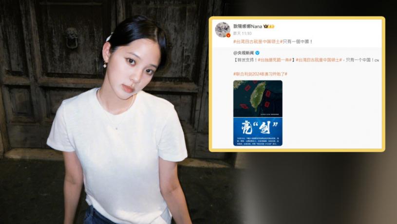 解放軍在昨天清晨實施「聯合利劍-2024B」軍事演習,大陸藝人跟進轉發央視新聞在微博發布「亮劍」圖卡,歐陽娜娜「搶頭香」轉發,她強調:「台灣自古就是中國領土,只有一個中國。」