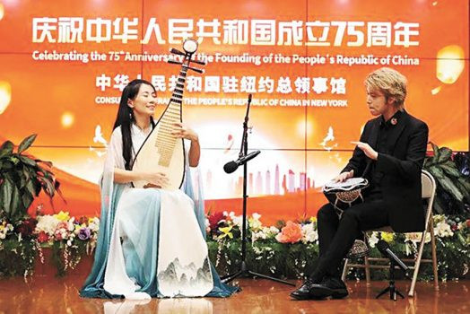 不久前在中國駐紐約總領館舉行的國慶75周年慶祝晚會中,中國音樂金鐘獎得主、琵琶演奏家楊瑾獲得中國旅美科技協會頒發的「中美友善藝術大使獎」,表彰她為中美文化交流作出的傑出貢獻。楊瑾在晚會中表演的琵琶打擊樂合奏《彝族舞曲》熱情奔放,展現了中國傳統樂器的獨特魅力和多姿多彩的少數民族文化,獲得來賓們熱列的掌聲。