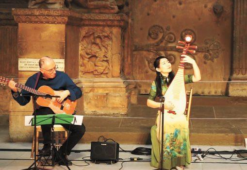 楊瑾(右)同吉他手合奏《彝族舞曲》。