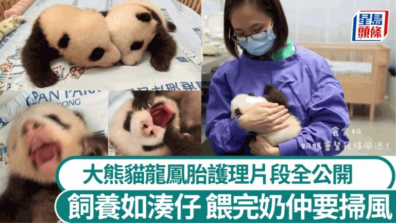 初生大熊貓體型細小,而在本港出生的大熊貓龍鳳胎目前兩個月大,海洋公園在社交平台上公開專家和護理員日常照顧BB的片段,以及牠們的最新體重:家姐重2.7公斤、細佬重2.54公斤,看來家姐的體重繼續領先細佬!熊貓得以「暴風式成長」,當然少不得飼養員每日餵奶,原來餵完奶,熊貓BB和人類幼崽一樣,都要由大人負責「掃風」。