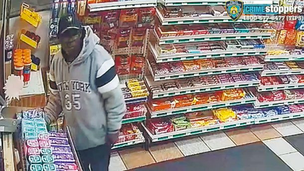 紐約警察局公佈的監控畫面及照片顯示,該名接近禿頭的疑犯年齡約50歲,體重約180磅。他身穿著一件印有「紐約」字樣及數字「35」的灰色連帽衫,以及黑色褲子與酒紅色運動鞋。未知疑犯在逃離現場之前是否成功偷取商品。
