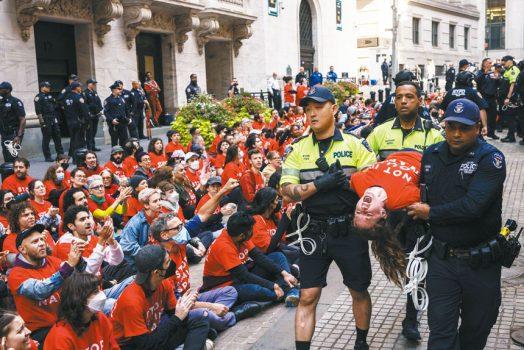 數百人早上開市前闖進紐約證券交易大樓外抗議。美聯社