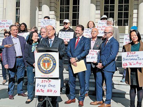 包括多名華人及同源會成員數十人16日市府階梯前說明今年大選投票將包含一項修改紐約州憲法的第一提案「平等保護法律修正案」,呼籲選民投票反對提案,因為這項提案表面合情合理,事實卻正是相反。