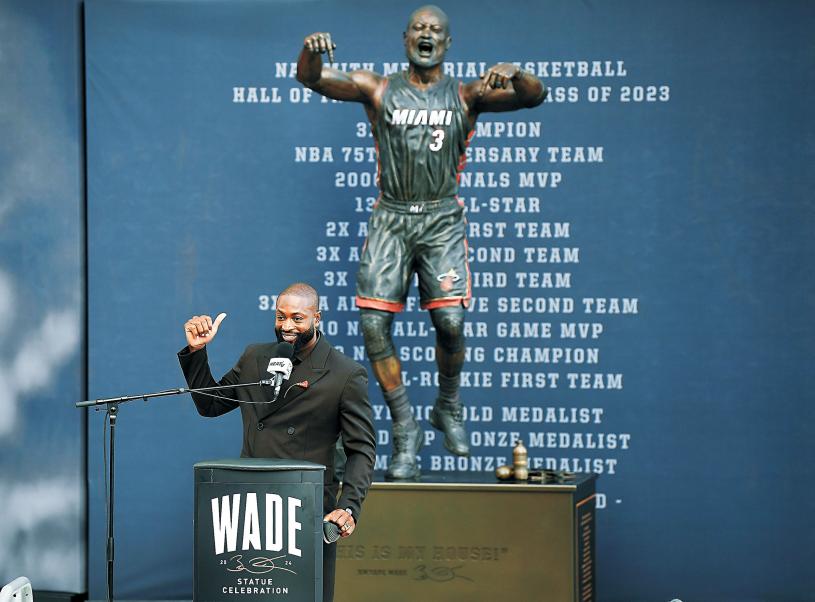 熱火27替當家傳奇球星韋德的3號熱火球衣雕像舉辦揭幕儀式,「閃電俠」帶著全家人出席。不過看到實際雕像模樣後,韋德不禁半開玩笑表示:「我真的不太敢相信,那傢夥是誰?」這是因為韋德站在那座雕像旁邊合照,雕像跟本人簡直就像完全不同的兩個人(見圖)。