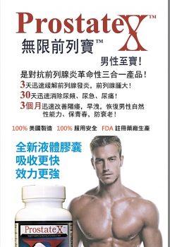 美國無限藍夢藥業集團全新推「無限前列寶」Prostate X™,對抗前列腺炎革命性三合一產品,具有「3天」迅速緩解前列腺發炎,前列腺腫大!「30天」迅速消除尿頻、尿急、尿痛!「3個月」迅速改善陽痿,早洩,恢復男性自然性功能,保青春,防衰老的功效。純天然植物提取物配方,無毒副作用,長期服用,安全可靠,不會出現像服用處方藥而導致的性能力下降等副作用。它是目前市場上唯一由純天然提煉,既能對抗前列腺炎症,又可以增加男性性功能的純天然良方。是美國著名泌尿專科「唯一」推薦前列腺保健聖品,美國GMP/NSF藥廠生產製造,質量保證,安全可靠。