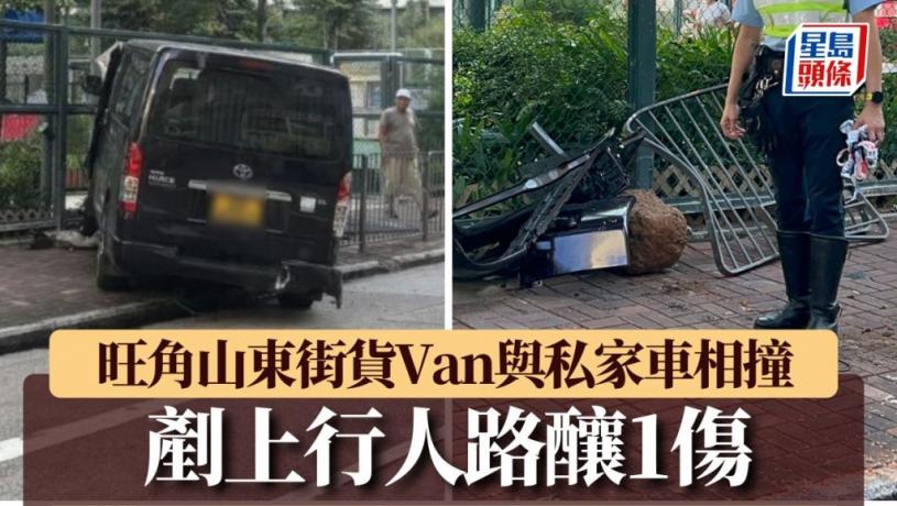 今日(31日)早上7時51分,旺角山東街往染布房街方向近麥花臣遊樂場對開,一輛貨Van與私家車相撞。貨Van繼而剷上行人路,撞毀約1米鐵欄及遊樂場圍網,私家車則車頭損毀,泵把鬆脫。意外中,客貨車司機受傷,由救援人員到場治理。