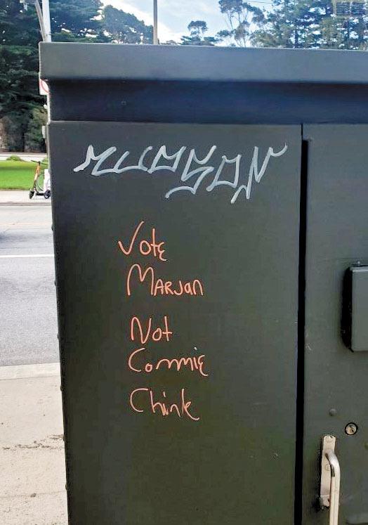 兩個塗鴉分別在25街夾Lake街,及25街夾Fulton街,都寫著「Vote Marjan Not Commie Ch**k」,意即「投邁珍,不投陳詩敏」。「Commie」指共產主義者,「Ch**k」是辱華字眼,兩字發音與陳詩敏英文名「Connie Chan」相近。