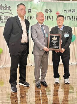 培德中心三十而立,歡樂的晚會中由董事會主席John Wong(左)、資深董事會成員Cheuk Yung (右)頒發貢獻獎予行政主任吳常義(中)。 梁敏育攝