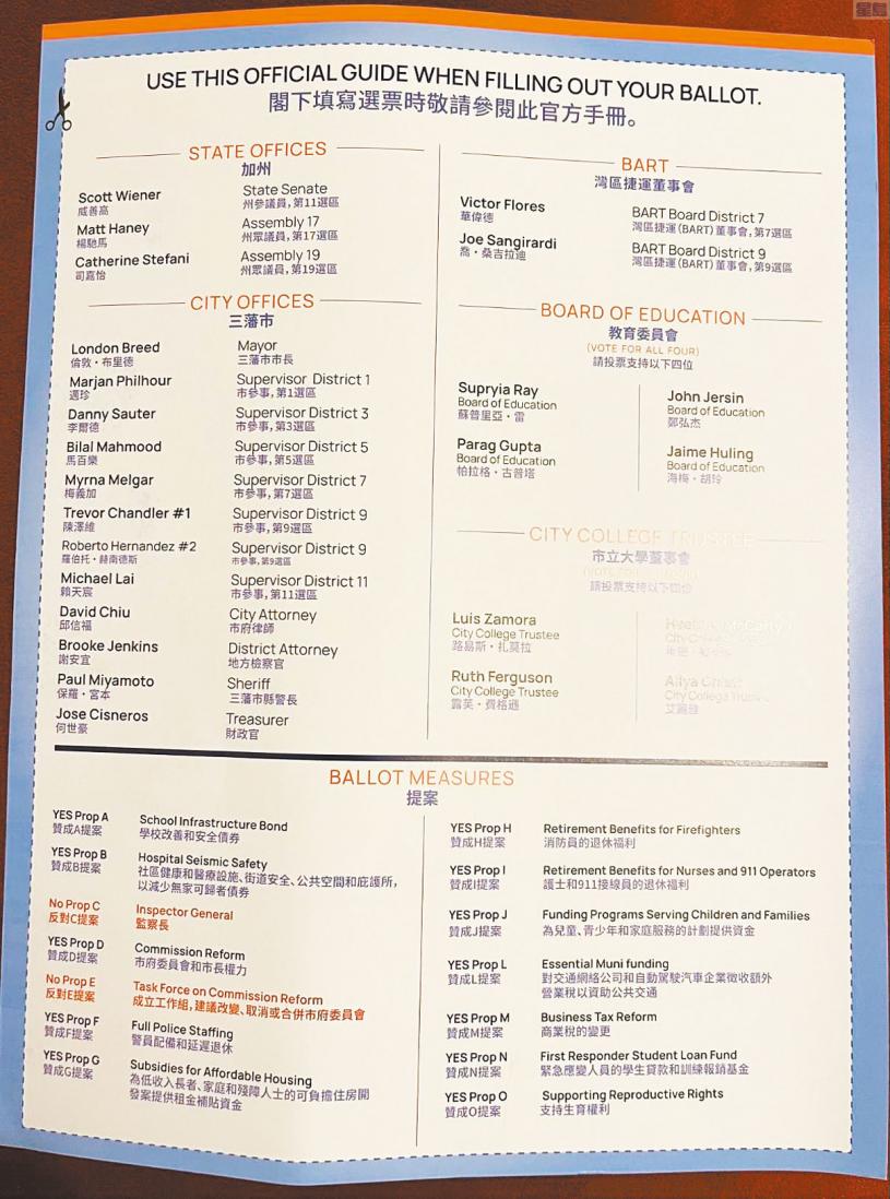 有同一組織的傳單分別印有英文版和中文版,照理來說兩個版本應該一致,然而在三藩市民主黨縣中央委員會(DCCC)英文背書名單上支持的「K提案」,在中文版上卻神秘消失了。