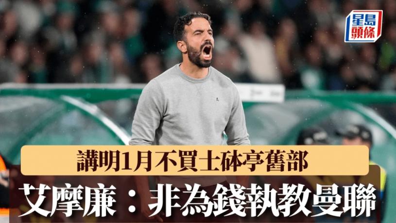 曼聯周五宣布士砵亭主帥魯賓艾摩廉將成為球隊新主教練,並於本月中國際賽期間正式上任。官宣後,艾摩廉同日領士砵亭於葡超主場5:1大勝艾馬多拉,他出席賽後記者會時透露曾要求季後才接手,惟被曼聯拒絕。他也強調並非為錢而決定入魔,同時表明1月轉會市場不會買舊部。