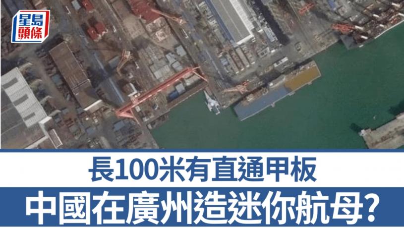 美國媒體報道引最新衛星照片報道,位於廣州龍穴島的廣船國際股份有限公司造船基地,正在打造一艘不尋常的大型開放平頂的船艦,船艦約200米長,比目前中國服役中的航母小,像是縮小版的輕型航母,疑是一種新型的航空母艦。美國專家猜測,這可能是全球首艘名義上是海洋科研船,實則具軍事應用力量的「軍民兩用航母」,將迅速提升中國海上戰力。