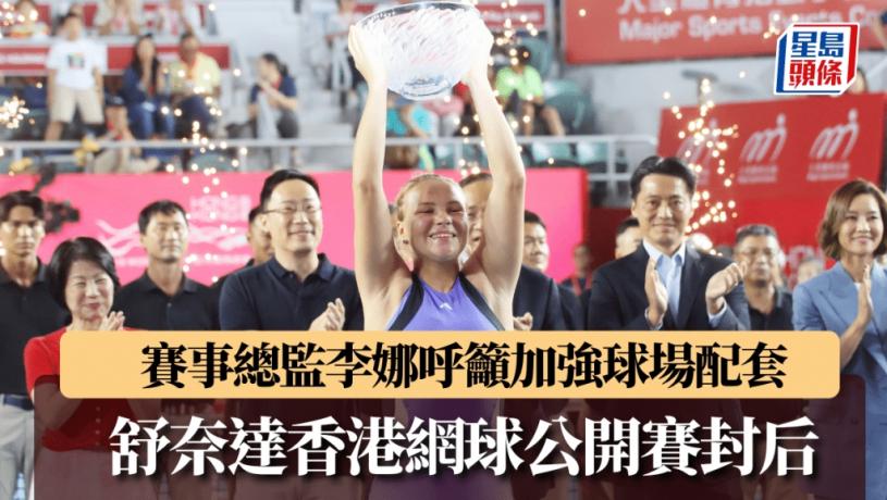 首次擔任「賽事總監」的中國女網傳奇李娜,周日趁在維園舉行的保誠香港網球公開賽(WTA250)最後一天比賽,大談她首做總監的感受,更坦言「香港軟件很好,但硬件不足」,認為要辦更高級別的比賽,必須要加強場地配套;而女單決賽,最終在全場爆滿下由年僅20歲來自俄羅斯的舒奈達以6:1、6:2勝英國一姐波爾達,首度在香港奪冠,周一會跟家人去迪士尼樂園慶祝。