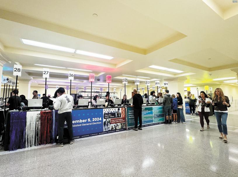 星期天是大選前兩天,三藩市選務處的投票大廳從上午10時起就出現絡繹不絕前來投票的市民,或站或坐在投票亭前,猶如考試中認真填寫試卷的考生。