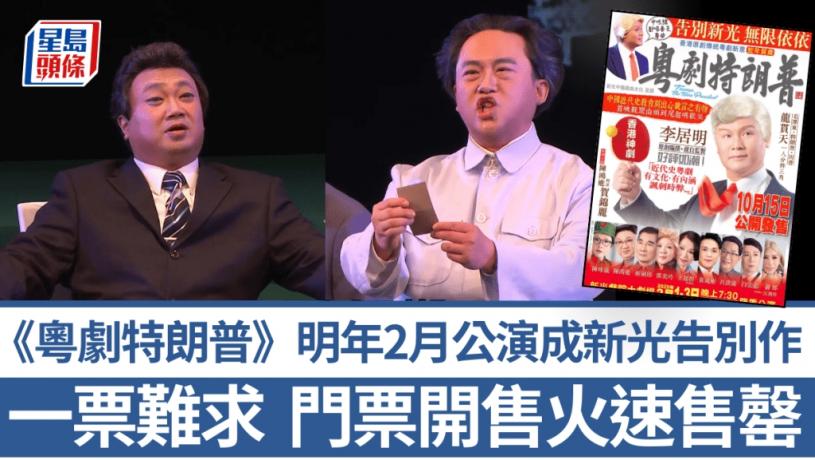 由龍貫天、陳咏儀和陳鴻進主演的《粵劇特朗普》將於明年2月1日-3日上映,此劇將成為新光戲院告別作,李居明曾表示:「我鍾意睇龍貫天演特朗普,陳鴻進演賀錦麗,滿足好多後生仔睇粵劇嘅願望,仲有啲老人家都好鍾意睇,講起就由頭笑到落尾。」門票在日前公開發售,票價由180-500元不等,不過三場門票開售不久已經火速售罄,成績相當理想。