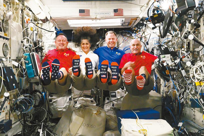 綜合ABC與《印度斯坦時報》報道,駐守國際太空站的威廉斯(Suni Williams)、威莫爾(Butch Wilmore)、佩蒂特(Don Pettit)和黑格(Nick Hague)5日分享照片,從中可見他們完成投票後,清一色穿上美國國旗圖案的襪子,留言信息也表示,「不管你們坐著、站著還是漂浮著,重要的是去投票!」