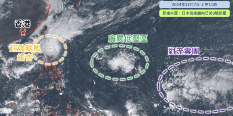 另外,天文台在網站《天氣隨筆》專欄中提到,從衛星圖像可見,菲律賓以東的西北太平洋有一廣闊低壓區,而在該廣闊低壓區東面有另外一些對流雲團正在發展。