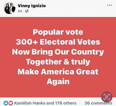 《紐約郵報》報道,11月5日選舉結束後,紐約市選舉委員會副執行董事、共和黨人伊格尼齊奧(Vincent Ignizio)在其個人臉書帳戶上發表聲明稱,「超過300張選舉人票,現在讓我們的國家團結起來,真正讓美國再次偉大。」