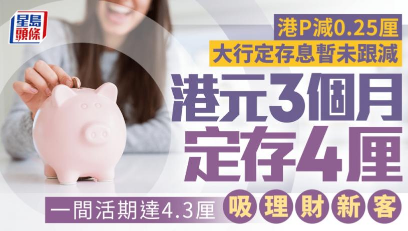 美國聯儲局上周宣布減息0.25厘,多間本港銀行亦宣布今日(11日)起下調最優惠利率(P息)0.25厘,並同步下調活期存款利率。截至上周末,大型銀行的定期存款息率暫時仍按兵不動,僅個別中小行及數字銀行率先輕微下調存息。目前港元3個月定存中,仍有銀行提供4厘高息優惠吸引大客;另有銀行為吸納理財新客,推出最高4.3厘活期存款推廣。