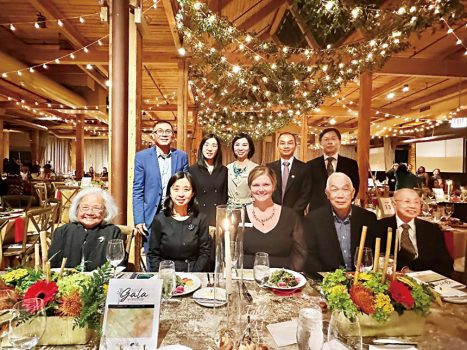 華諮處年會冠蓋滿華庭,在華諮處促進部門副總裁安媛迪(前中)、華諮處社區服務總監徐婕雯(後中)陪同下,中國駐芝加哥總領館張宜琪副總領事(前坐左2)等眾嘉賓們歡聚一堂。 梁敏育攝