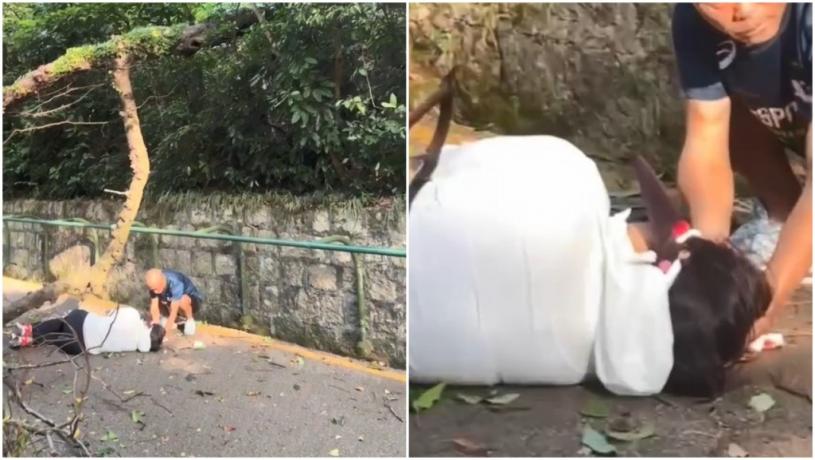 根據網上片段所見,女子遭大樹的樹椏擊中後,倒卧跑步徑上, 一名男子上前了解她的傷勢。