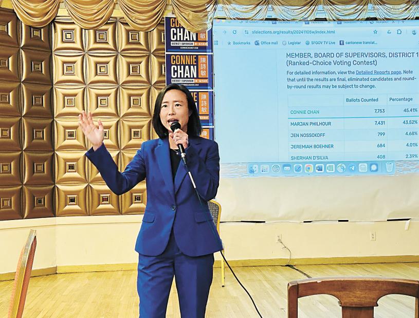根據三藩市選務局11日下午公佈的最新一輪初步點票結果,今年11月六個單數市參事選區已有五個決出勝負,華人關注的第一選區現任市參事陳詩敏(Connie Chan)連任成功,第11區市參事兩名華裔候選人得票繼續纏鬥,陳小焱(Chyanne Chen)微幅超前對手賴天宸(Michael Lai)207張。
