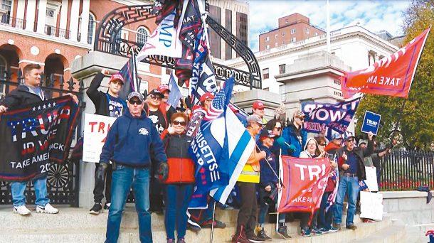 一群抗議者聚集在麻州有兩百年歷史的州府大樓前,支持當選總統特朗普驅逐無證移民的計劃。抗議者說,他們同時為慶祝特朗普在2024年總統大選中獲勝,以及他在麻州這個藍州獲得的大量選票。