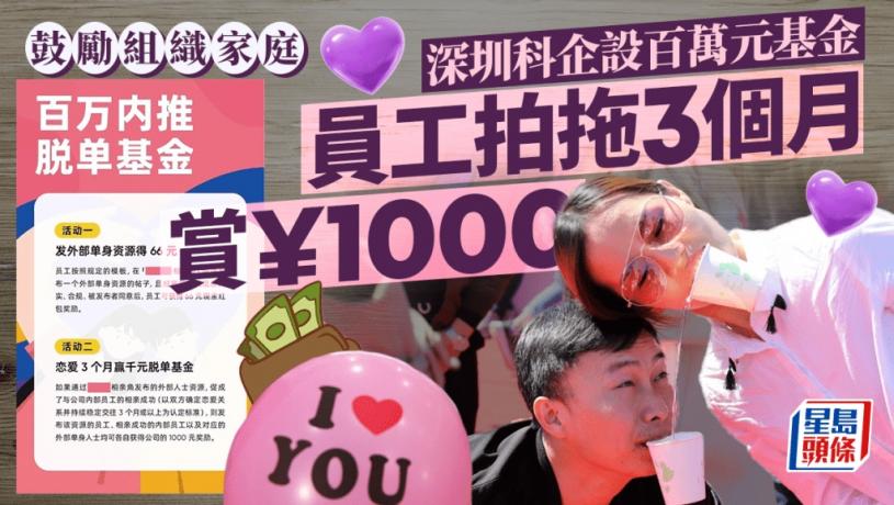 內地年輕人晚婚、不婚已成社會問題。深圳有科企推出百萬脫單基金,鼓勵「單身狗」員工找伴侶談戀愛,在公司「相親角」刊出外部單身者資料可得¥66利是;相睇成功並拍拖3個月,男女雙方及說媒人員工可各得¥1000。