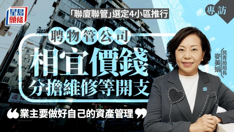 【施政報告/聯廈聯管/麥美娟/民政及青年事務局】《施政報告》宣布進一步推行改善大廈管理措施,包括選定小區推行「聯廈聯管」試驗計劃,民政事務總署正敲定試驗計劃細節。民政及青年事務局局長麥美娟接受《星島》專訪時表示,明年初將選定4個小區推行「聯廈聯管」試驗計劃,初步考慮在油尖旺、九龍城及深水埗等區,主要針對樓齡較高、未有物管公司的單幢樓,試驗計劃將數幢大廈統籌成「小型屋苑」,以較低價錢購買集體保險,分擔維修等費用。她強調計劃成功與否,在於相關業主有否意識做好樓宇管理。