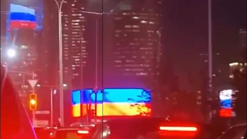 網傳影片顯示,該城市街上的大屏幕出現了不少俄羅斯國旗的圖像,歡迎普京的到訪,但其中一片螢幕卻顯示代表烏克蘭的上藍下黃雙色旗。