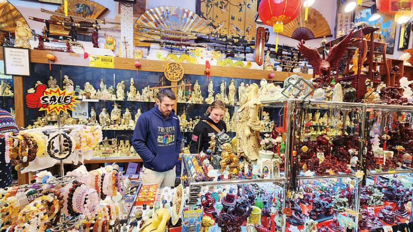 她提到今年整體的生意比去年相比也有提高,但總體營業水平較疫情前相比恢復的還只佔一半多一些。這種禮品店舖平日接待歐洲和東南亞遊客更多,中國來的遊客很少。一般中國遊客會去大商場買大品牌的打折商品,不太會來華埠購買這些小禮品,但會來華埠吃飯。
