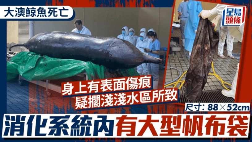 漁護署又指由於解剖分析仍然進行中,鯨魚的品種詳細資料將稍後公布,解剖期間,海洋公園及海洋公園保育基金獸醫團隊未有發現鯨魚身上有被螺旋槳傷害或曾受船隻猛烈撞擊的痕跡,但獸醫在鯨魚身上發現有一些表面傷痕,可能因鯨魚曾擱淺於淺水區域而造成,獸醫亦發現在鯨魚的消化系統內有一個大型帆布袋(尺寸:88x52cm),但鯨魚最終死因需要進一步分析。