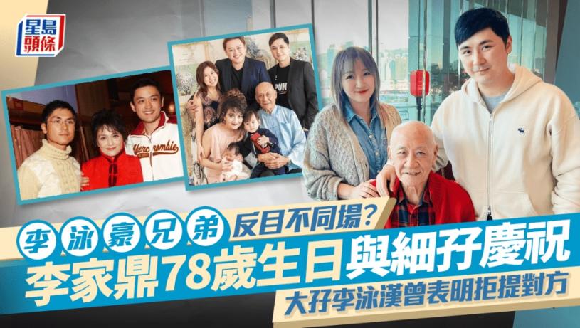 人稱「鼎爺」的李家鼎縱橫影視圈近60年,螢幕前經常被派演惡人、江湖人物等角色,近來年憑《阿爺廚房》系列展現高超廚藝,再攀事業高峰。李家鼎上月迎來78歲生日,兒子李泳豪近日孖老婆Agnes同爸爸食午飯補祝生日,而李泳漢卻完全冇影。有指施明不滿李泳豪娶台灣太太,兩兄弟又因施明在家中跌倒導致頭部重創,需要做開腦手術保命,事件弄致兄弟不和。